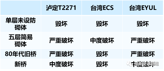 进一步对比三个地震动记录对其他典型工程的破坏,可以看出。由于单层未设防砌体抗震性能太差,三个地震动记录都会导致毁坏的结果。而对于五层简易砌体,由于其周期较短,而花莲地震ECS地震动的短周期段不是很强,所以破坏程度相对其他两个地震动要轻一些。而由于花莲地震ECS地震动的中长周期段非常强,因此无论是新旧桥梁,都会导致严重破坏。这也与这次台湾花莲地震后大量桥梁严重破坏的震害结论是一致的。