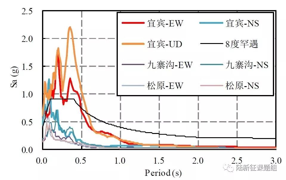 这次宜宾长宁6.0级地震也呈现出这样一个特性。对于大部分台站的记录,地面峰值加速度基本在75cm/s/s以下。照说不会造成那么严重的破坏和人员伤亡。但是在震中附近的地面运动却非常特殊。这次地震51GXT台站测得了约0.6g的峰值加速度,其短周期段反应谱不仅远高于当地设防烈度(6度)反应谱,而且也高于此前九寨沟地震(7级)、20180528松原地震(5.7级)等(图1、2),从而导致了严重的后果。