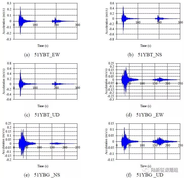 同时,城市抗震弹塑性分析还能考虑余震影响(参见本课题组此前文章:如果遭遇与06-18大阪6.1级地震相当的余震,则大阪的损失会怎样?)。宜宾6.0级地震后,不断有余震发生,使灾区人员感到恐慌,其中最大余震为6月18日7时34分在四川宜宾市长宁县发生的5.3级地震,该次地震根据中国地震台网正式测定,震源深度17千米,震中位于北纬28.37度,东经104.89度。我们通过强震台网获取了2个台站的主震和余震地震动记录,将主震记录与余震记录连接到一起即可得到主余震序列,如图4所示。