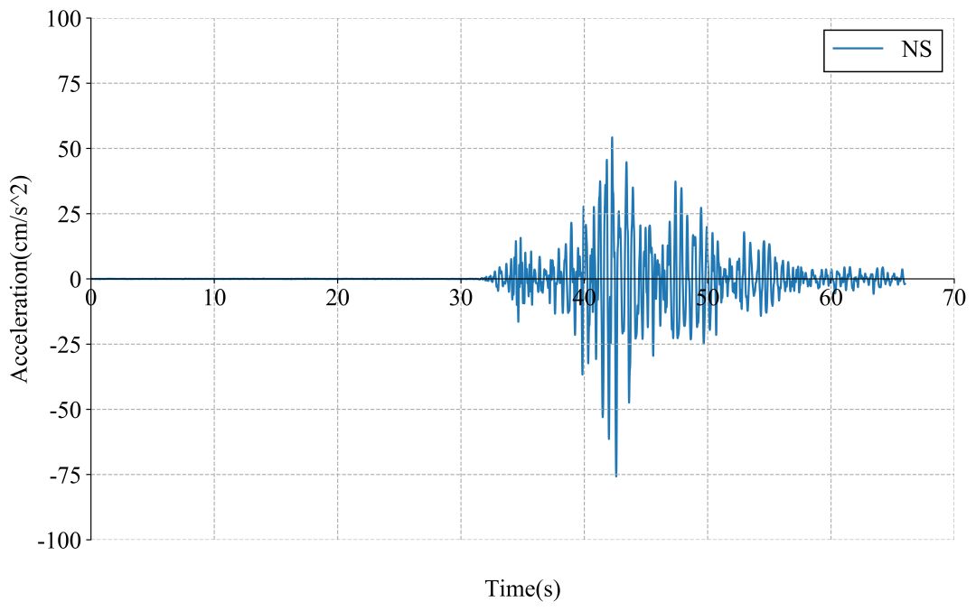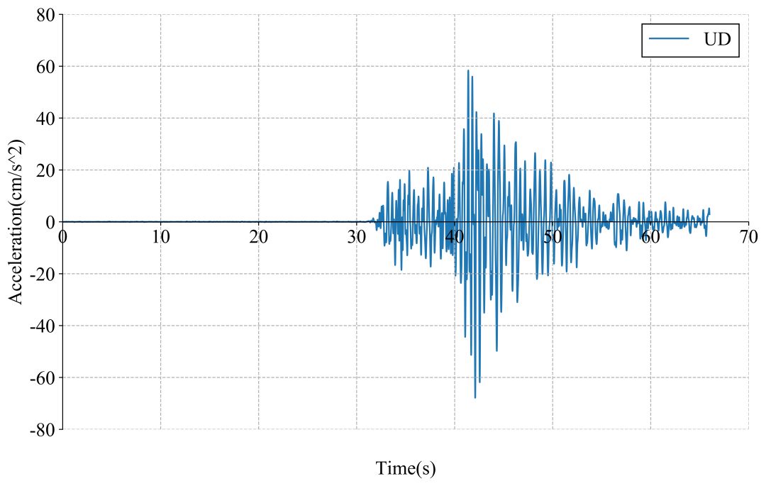 51GXT记录台站位置北纬28.43度,东经104.70度(图1,其中红色五角星为震中位置),记录到地震动峰值加速度为599.2cm/s/s。该地震动如图2、图3所示。