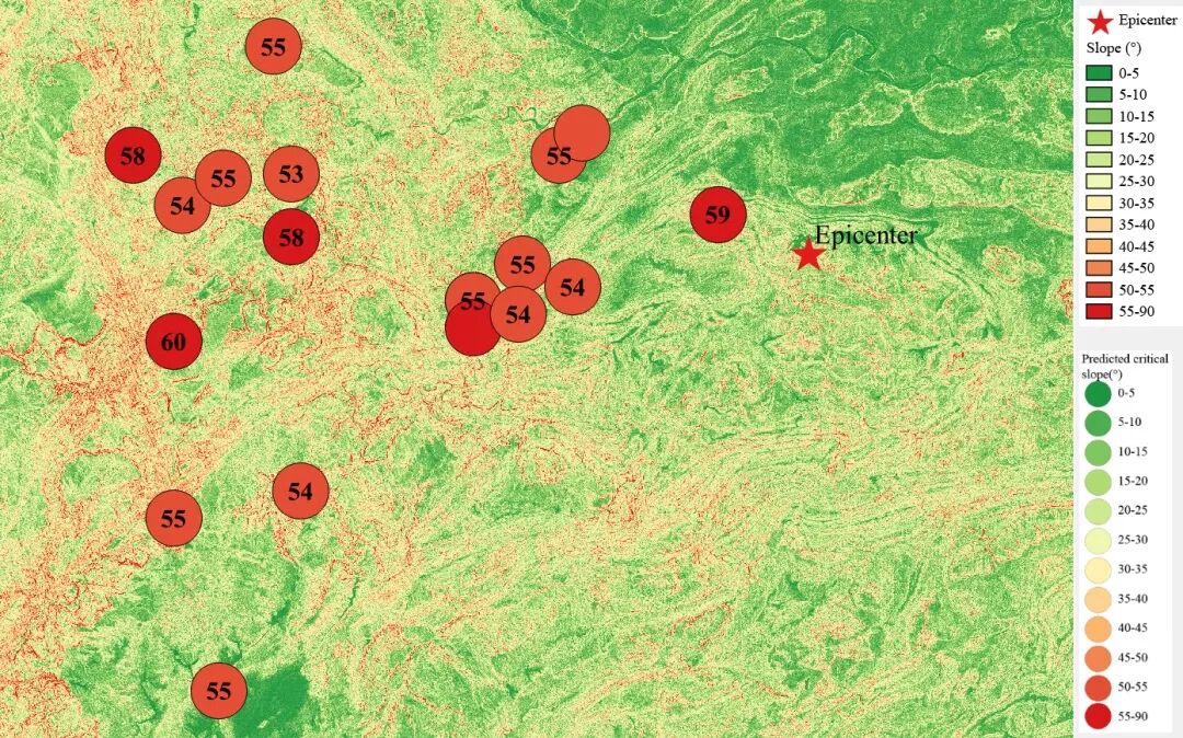根据当地地形数据、岩性数据和实测地面运动记录,可以计算得到不同滑坡体饱和比例下的滑坡分布,如图12所示。其中,底图为当地坡度分布图,每个圆圈代表每个台站的计算结果,圆圈中的数字代表发生滑坡的临界坡度,台站附近坡度大于该数值的地方滑坡发生概率高。