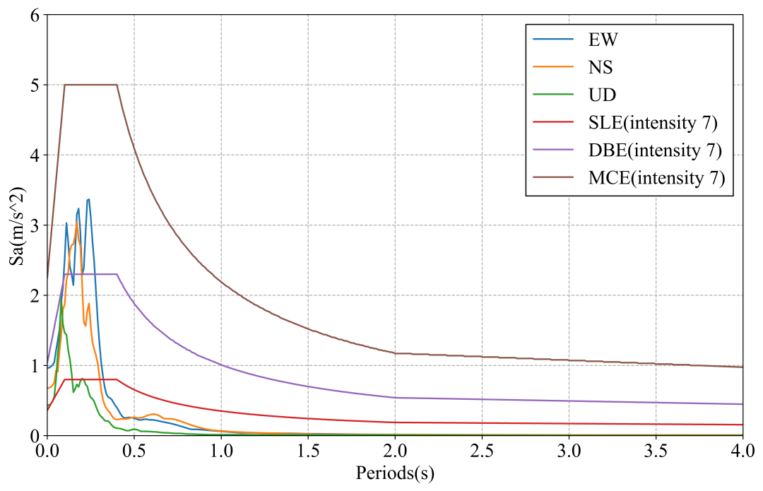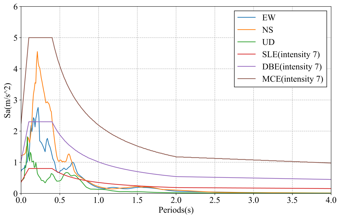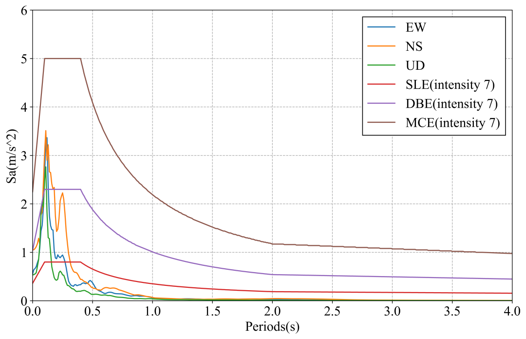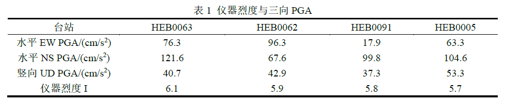 图4为中国地震台网中心在震后快速自动生成的仪器烈度图。其中,最高仪器烈度为6.1度,其余台站均低于6度。表1给出了4个典型台站的仪器烈度和三向PGA,图5给出了对应台站的反应谱,台站的大致位置标注于图3中。典型台站的仪器烈度均接近6度,说明本次地震会对这些台站周围的建筑造成一定破坏。对比图3和图4可以发现,5度区内的台站仪器烈度基本上都在5.5度以上,说明仪器烈度能够为震害评估提供合理参考。
