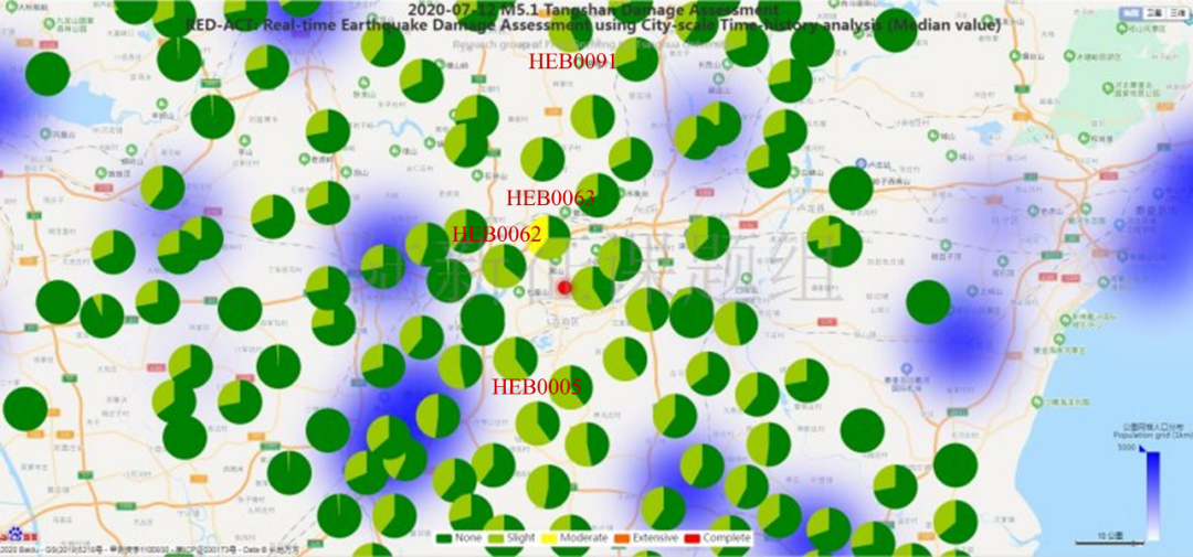 利用密布强震台网在震后获取的实时地震动信息,再结合城市抗震弹塑性分析,就可以得到地震发生后不同地点的建筑破坏情况。本次地震RED-ACT给出的分析结果为:震中附近台站的震损主要是“轻微破坏”或“完好”,只有一个台站出现“中等破坏”,较远处台站主要是“完好”,如图6所示。
