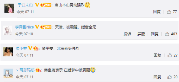 人民日报微博[7]下面的网友评论显示,唐山、天津、北京、秦皇岛等地均有震感,多人表示被震醒,如图9所示。