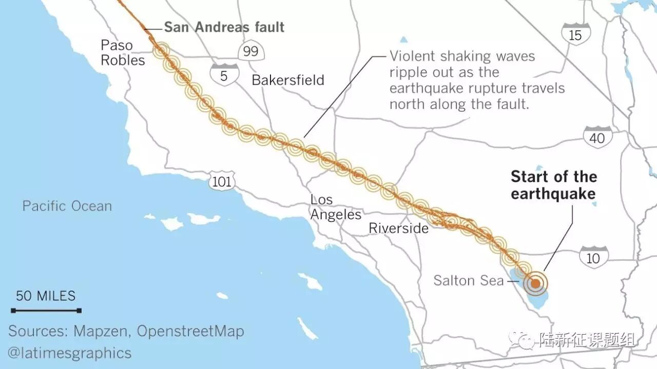 一场8.2级地震将使萨尔顿海处的圣安地列斯(San Andreas)断层破裂,该断层从靠近墨西哥边界处一直延伸到蒙特雷地区。这个断层会影响包括洛杉矶,河滨和圣贝尔纳迪诺在内的多地。