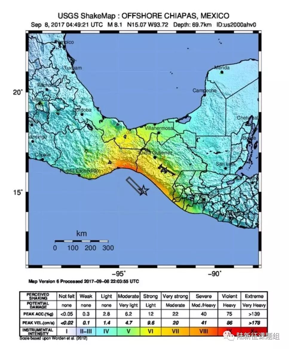 周四的墨西哥地震中,陆地上地震烈度最大为9度,即“极其剧烈的(violent)”震动,在图中用红色表示。震中位置在图中用星表示,断层发生移动的区域用矩形示意。(美国地质调查局)