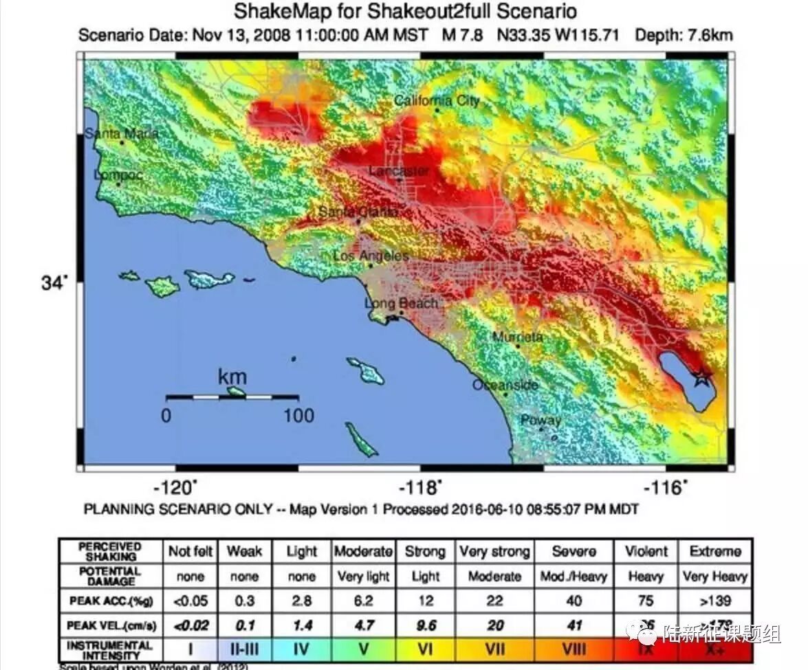 7.8级地震如发生在南加州,将会在该州的一大片区域内引发烈度达到10度的震动——极端的(extreme)震动。(美国地质调查局)