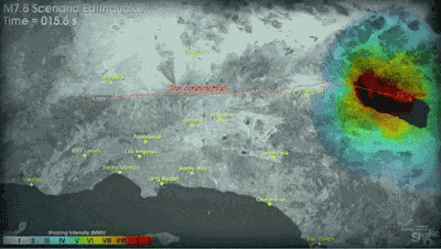 美国地质调查局发布了对圣安地列斯断层发生7.8级地这一情况的模拟结果。 该模拟结果有助于我们想象8.2级地震将对南加州大部造成何种影响。这两次地震模拟中,洛杉矶的震动强度大致相当,但是8.2级地震会对西北部更大的范围内引起震动,比如圣巴巴拉和圣路易斯奥比斯波。