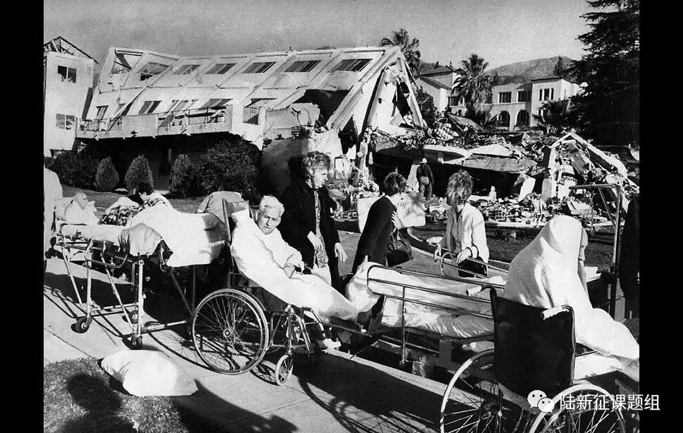 1971年西尔马(Sylmar )地震中,人们从倒塌的圣费尔南多谷医院中撤离病人。(洛杉矶时报)