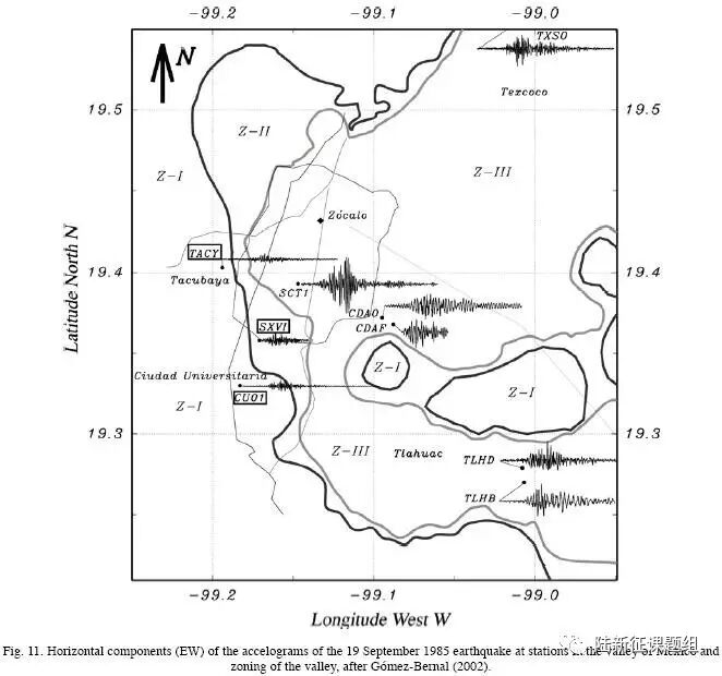 首先,说到墨西哥城,这是一个非常独特的城市。它坐落在一个古代大湖沉积而成的盆地上(图1),由于盆地及沉积软土带来的复杂影响,地震波会在盆地和周围反复振荡反射(图2),因此墨西哥城的地震一向是非常特立独行的。图3是墨西哥城在1985年地震时记录到的地震动,可见局部场地的影响非常大,坐落在盆地上的地震动就非常强,而非盆地的地震动相对就弱的多。