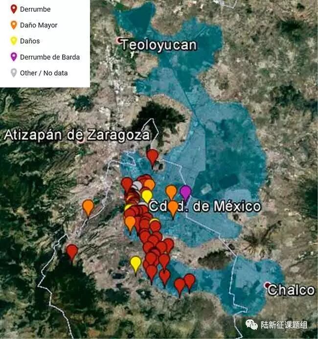 这次地震,墨西哥城的局部场地效应再次发威,图4显示的是本次地震在墨西哥城造成的建筑震害分布,蓝色区域是古代湖面的位置,可见相关关系非常明显。