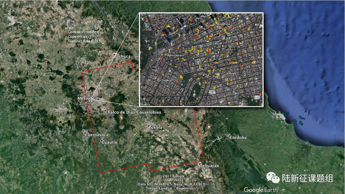 图5 NASA提供的墨西哥城建筑震害分布(https://www.jpl.nasa.gov/news/news.php?feature=6951)