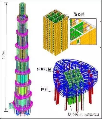 上海中心大厦和中国尊大厦,分别位于我国抗震设防烈度7度区(上海)和8度区(北京)。上海中心大厦主体塔楼共124层,塔顶建筑高度为632m,结构高度为580m,为“巨柱—核心筒—伸臂桁架”的混合抗侧力结构体系,卢啸等基于2010年1月上海中心设计方案,采用通用有限元软件MSC.Marc,建立了其有限元模型(如图10);中国尊大厦(在建)塔楼共108层,建筑高度528米,采用了“巨型支撑框架-核心筒”的混合抗侧力体系,卢啸等同样采用通用有限元软件MSC.Marc,建立了其有限元模型(如图11)。
