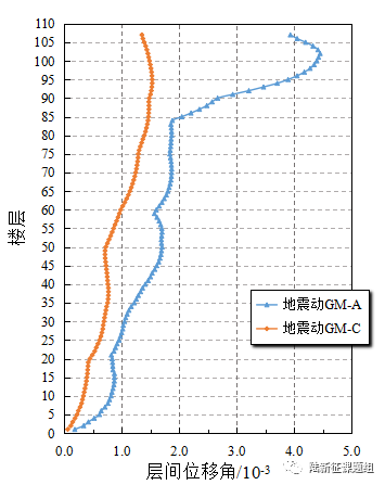 特别值得关注的是,在地震动A作用下,两栋超高层建筑顶部都出现了超过0.5g的楼面加速度,存在较为明显的加速度放大效应。这样剧烈的楼面加速度有可能会引起超高层顶部结构非结构构件破坏。