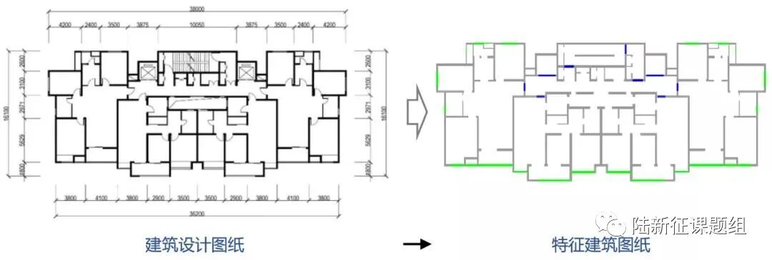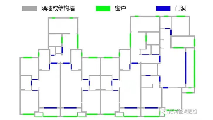 第二步,对该户型平面图进行处理,得到智能化结构方案设计需要的输入文件(图2)。典型设计图纸特征初步提取过程如图3所示,其中灰色代表隔墙或结构墙,绿色代表窗户,蓝色代表门洞。