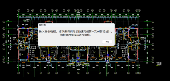 用户点击“案例引导”功能按钮(图1),即可打开已经准备好的建筑图纸,并进入引导界面(图2),点击确认后,软件将弹出案例引导操作视频的对话框(图3)。