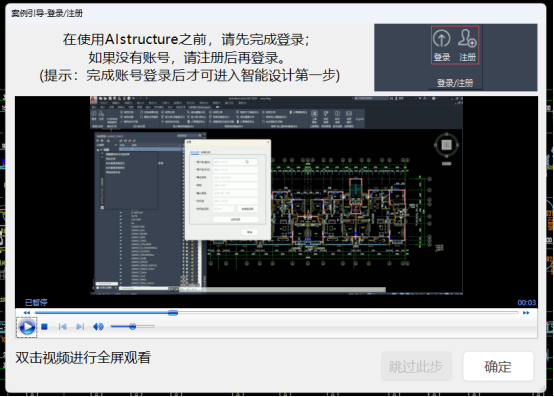 特别需要指出的是,前6个步骤为完成智能设计所必须的步骤,不可以跳过,用户必须逐一操作才能完成智能设计;而“结构建模分析”、“剪力墙-梁优化”、“计算模型导出”三个步骤为用户可以选择的分析功能,用户可以选择“跳过此步”不去进行视频学习和操作。全部案例引导步骤完成后,软件将自动退出案例引导模块。