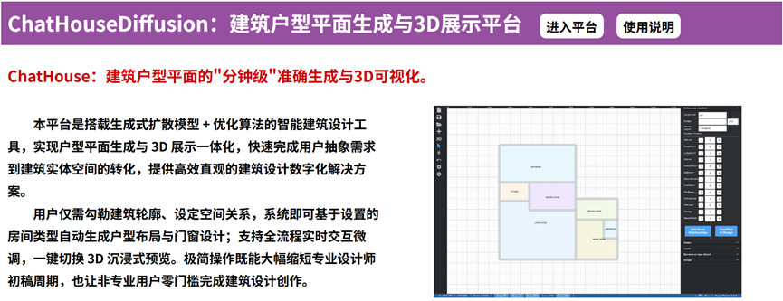 图1 ChatHouseDiffusion:建筑户型平面生成与3D展示平台