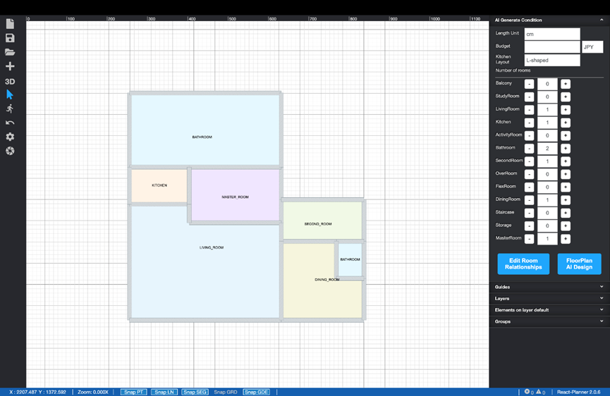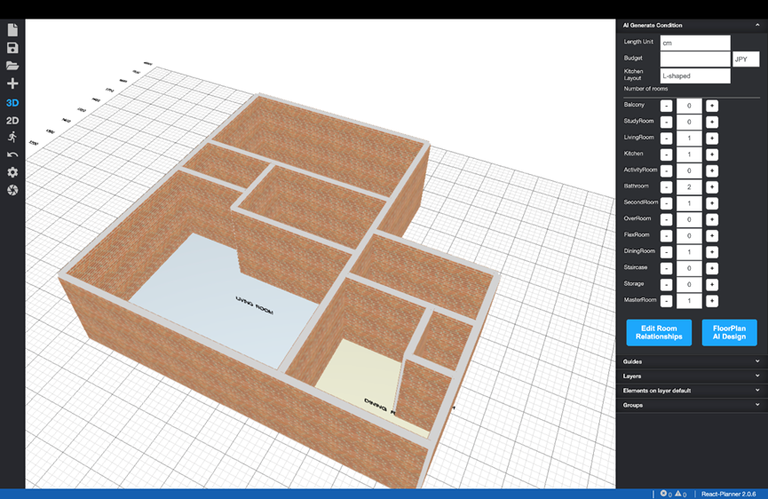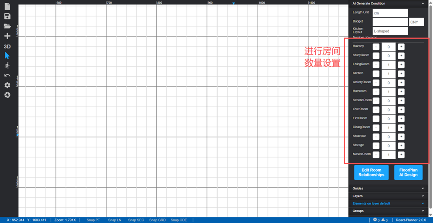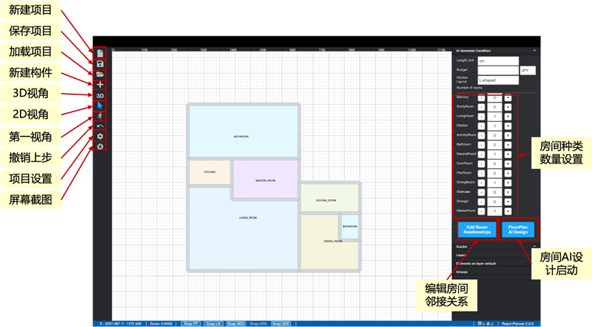 (2)用户可通过平台右侧的“户型设计栏”定义房间类型、数量以及房间之间的连接关系,并启动AI设计。