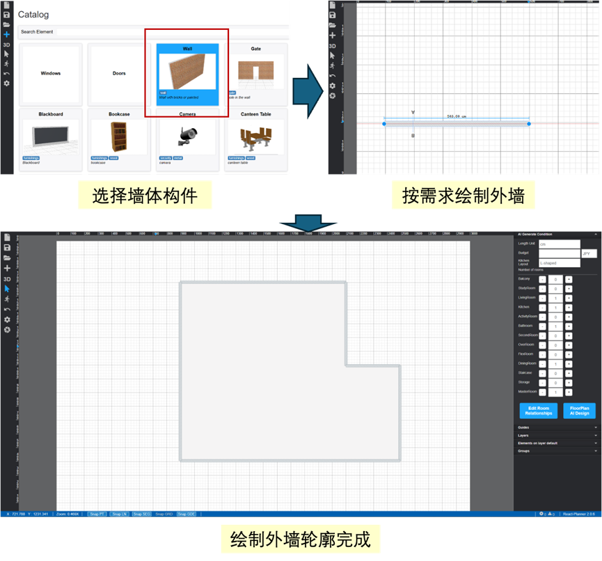 通常在进行户型布局设计时,建筑外轮廓形状已经确定,用户可以根据实际的建筑平面外轮廓,在画布上绘制该轮廓,作为户型平面设计的基础,具体操作步骤如下(图3):