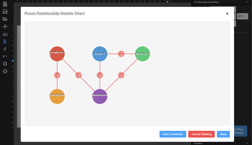 完成房间类型和数量的设置后,点击编辑房间邻接关系按钮,即显示各房间数量设置对应的房间气泡。用户点击“Add Connection”按钮,即进入连接关系添加模式,鼠标左键单击需要添加邻接关系的两个房间对应的气泡,即可为选中的两个房间添加邻接线,如图5所示。