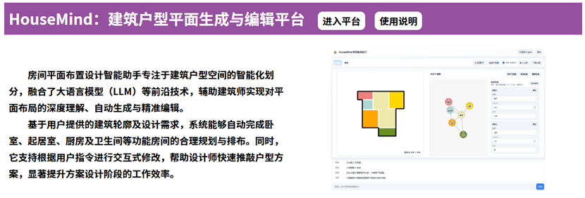 官网 (https:// ai-structure.com/#/IntelligentDesignLabs) 已上线新产品——HouseMind:建筑户型平面生成与编辑平台(图1)。该产品专注于建筑户型空间的智能化划分,融合了大语言模型(LLM)等前沿技术,辅助建筑师实现对平面布局的深度理解、自动生成与精准编辑。