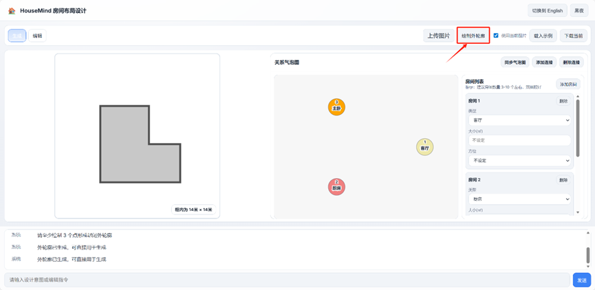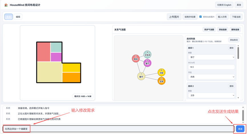 调整方式二(局部修改):点击“编辑”按钮进入编辑模式,在右侧列表中修改房间属性或在底部输入指令。