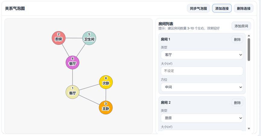 (4)逻辑编辑区:用于用户进行房间数量、功能、面积和逻辑关系等的设置,逻辑关系越清晰准确,生成的效果越好。其中,关系气泡图以可视化气泡形式展示房间及其连接关系,用户可以拖动房间位置来设置和调整房间之间的关系;房间列表可以详细设置每个房间的类型、面积和方位。