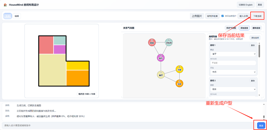 调整方式一(整体修改):保持“生成”模式,在右侧列表中修改房间属性(如将“次卧”改为“书房”,将“厨房”面积改小),或在气泡图中增删连线。