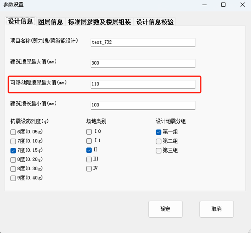 其中,需要用户特别注意的是“可移动隔墙厚最大值(mm)”这个选项,软件将根据该输入信息判断建筑图中的墙体是否为隔墙,图中墙厚小于等于该数值的墙体将被AI认为是隔墙,即后期设计时不布置剪力墙。