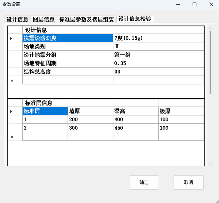 在菜单栏“参数设置”的功能里,增加了“设计信息校验”的选项,用户在完成基础参数设置和楼层组装等工作后,可通过该选项对设计信息、标准层信息和楼层组装情况进行检查和复核,如图所示。如设计信息有错误,可回到对应参数设置部分进行修改。