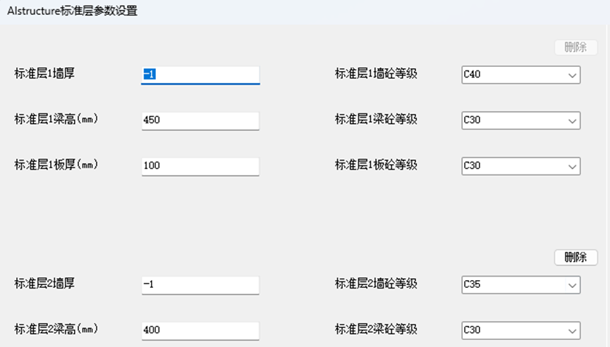 如果用户不进行人为指定,在“标准层参数设置”界面,可以选择墙厚为“-1”,表示墙厚由算法根据经验值给出,待设计完成后用户可通过“构件截面&荷载显示”功能进行查询。梁高默认值为400mm,板厚默认值为100mm。