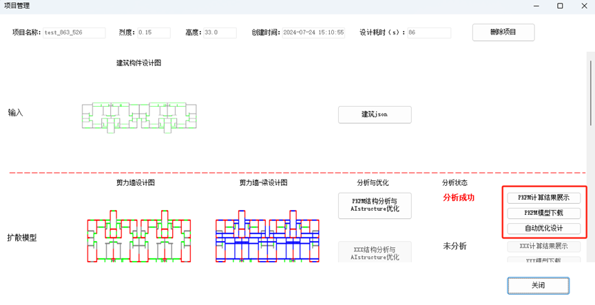 在完成AI智能设计后,用户可通过“结构分析与优化”功能,执行一次PKPM分析计算,生成PKPM模型的同时,也可以很快速的给出结构整体的大指标,便于用户核对是否满足规范要求。同时,软件也提供了自动优化设计的功能,指标超限在10%以内时,AI可以快速给出优化结果。