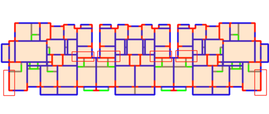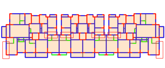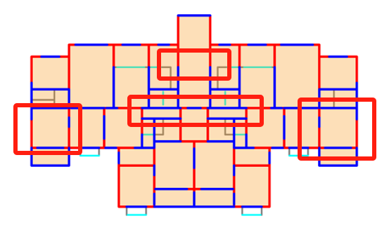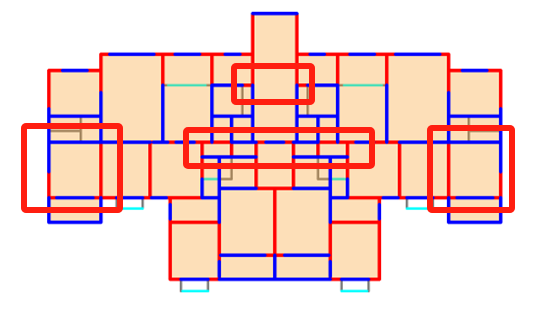 案例A: 如图1所示,某实际工程案例的标准层设计。在层高由2.8米调整为3米后,V0.3.4版本(图1a)的设计结果显示结构周期比为0.91,超出了规范限值要求。而0.3.5版本的设计结果如图1(b)所示,新版本的AI对部分剪力墙进行了延长,周期比为0.82,符合设计规范要求。
