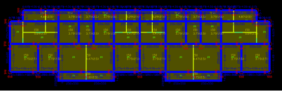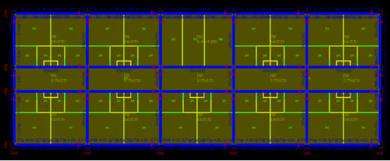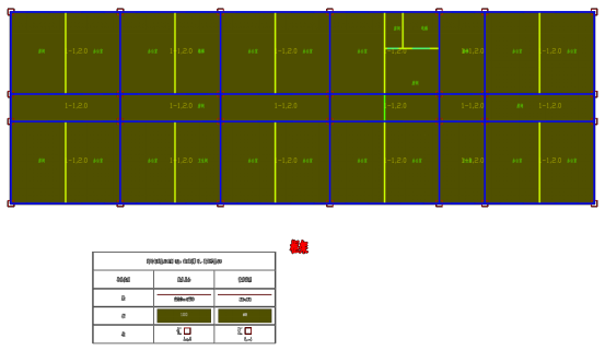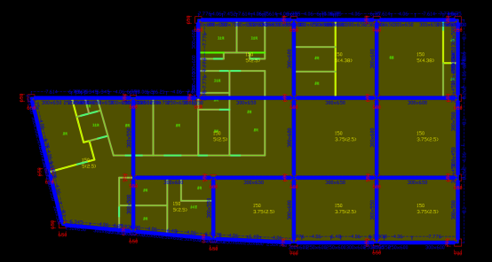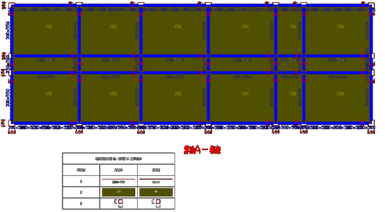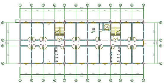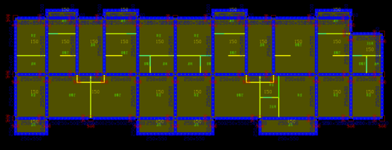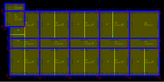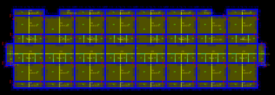 我们以一个高13.5m,跨度5.4m X 1.8m X 5.4m,位于8度区的框架为例,其建筑图如图2所示,前处理完成后的图纸如图3所示。其中,红色为柱子,黄色为建筑墙,蓝色为门窗。