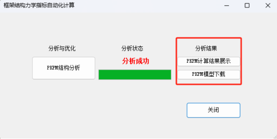 (6)自动结构建模和分析,软件可将用户调整后的设计结果直接在后台调用PKPM进行力学分析和计算,将分析结果展示给用户,同时用户可下载PKPM模型到本地,方便后续设计工作的开展。