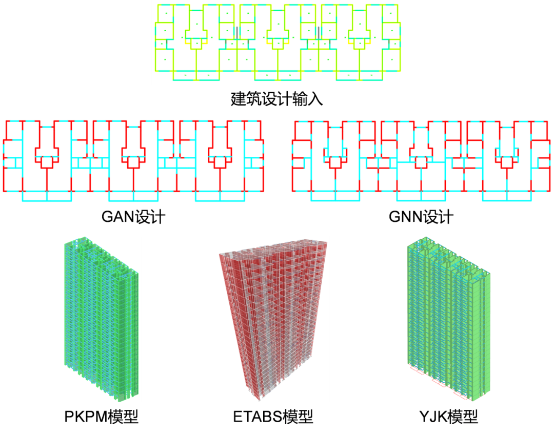 即对1个建筑设计方案进行前处理;采用智能生成算法可同时给出2个方案设计,分别为GAN和GNN的设计;随后可输出建模参数,采用我们提供的开源代码,建立PKPM、ETABS、YJK软件3套模型。