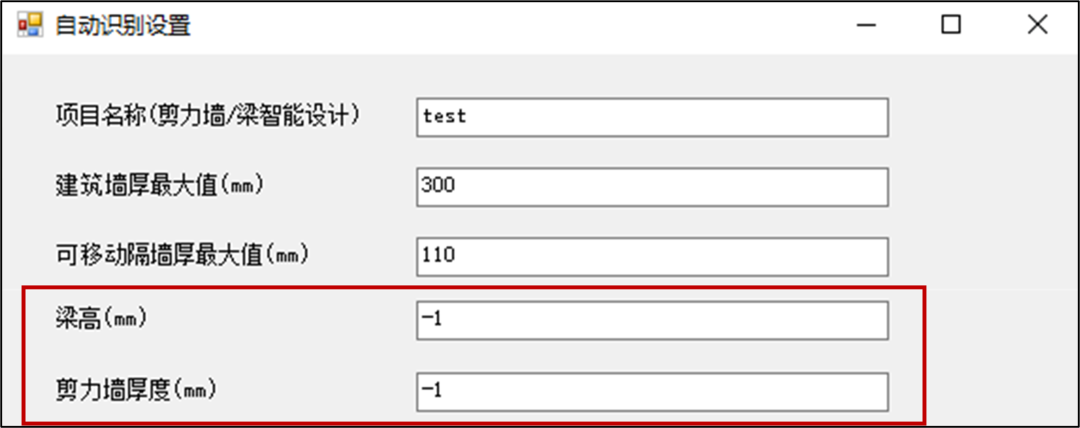 【软件改进】新增加了用户自定义剪力墙和梁构件截面尺寸的输入框,默认值为“-1”,若不更改,则程序根据设计条件自动生成对应尺寸。梁宽度与剪力墙厚度一致。