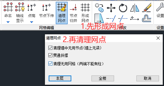 注意,YJK/PKPM模型,在楼板生成前,请先执行“形成网点”、“清理网点”的操作,可以更有效的生成楼板。