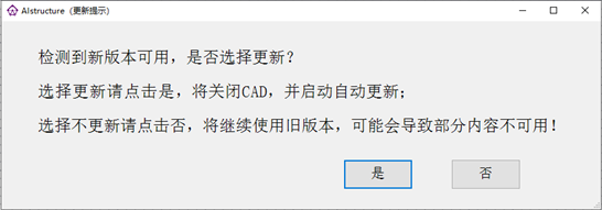 当我们的软件版本更新后,用户的程序会自动接收到软件更新的信息,并在重启CAD时,AIstructure会询问用户是否选择自动更新。