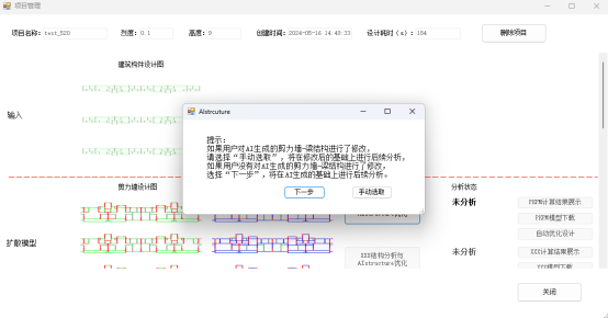 选取对应的AI设计结果后,点击“PKPM结构分析与AIstructure优化”按钮,可以开始分析优化,如下图。用户根据实际需要,如果无需对AI生成的设计结果进行修改,则直接点击“下一步”开始分析;如果用户在CAD界面中对AI生成的设计结果进行了相应的修改,则可点击“手动选取”,逐一选取修改后的标准层,在修改后的设计结果的基础上开始分析。