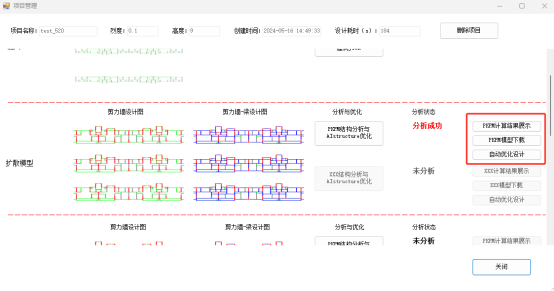 分析完成后,用户可以通过“PKPM计算结果展示”、“PKPM模型下载”和“自动优化设计”等按钮进行结果查看。