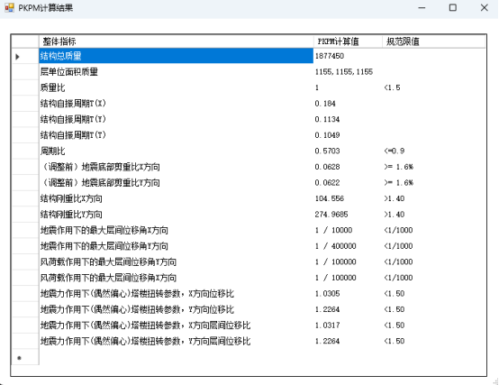 点击“PKPM计算结果展示”,将弹出如图对话框,其中将分析得到的关键指标展示给用户。