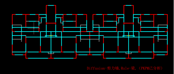 同样,点击“PKPM模型下载”按钮可以将优化后的PKPM模型下载到本地,供用户进行后续的设计操作;点击“自动优化设计”按钮,AI将优化后的设计结果绘制在CAD中(原生成方案的下方),同时也会将计算结果同步绘制在CAD中,如下图所示。