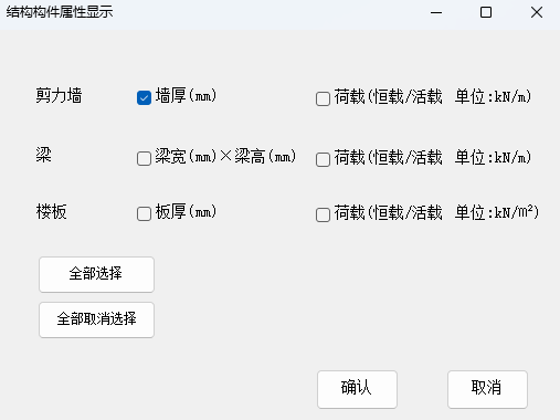 用户点击该功能按钮后,弹出“结构构件属性显示”窗口,如图所示。用户可以根据需要,选择相关构件和荷载进行显示。