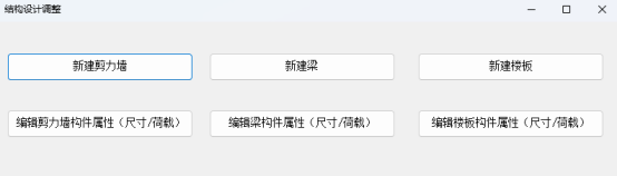 打开块编辑器后,点击“构件截面&荷载修改”功能按钮,将弹出“结构设计调整”界面,如图所示。用户可以根据需要,选择新增构件(详见2.3节),也可以对原有构件的属性进行调整(详见2.4节)。