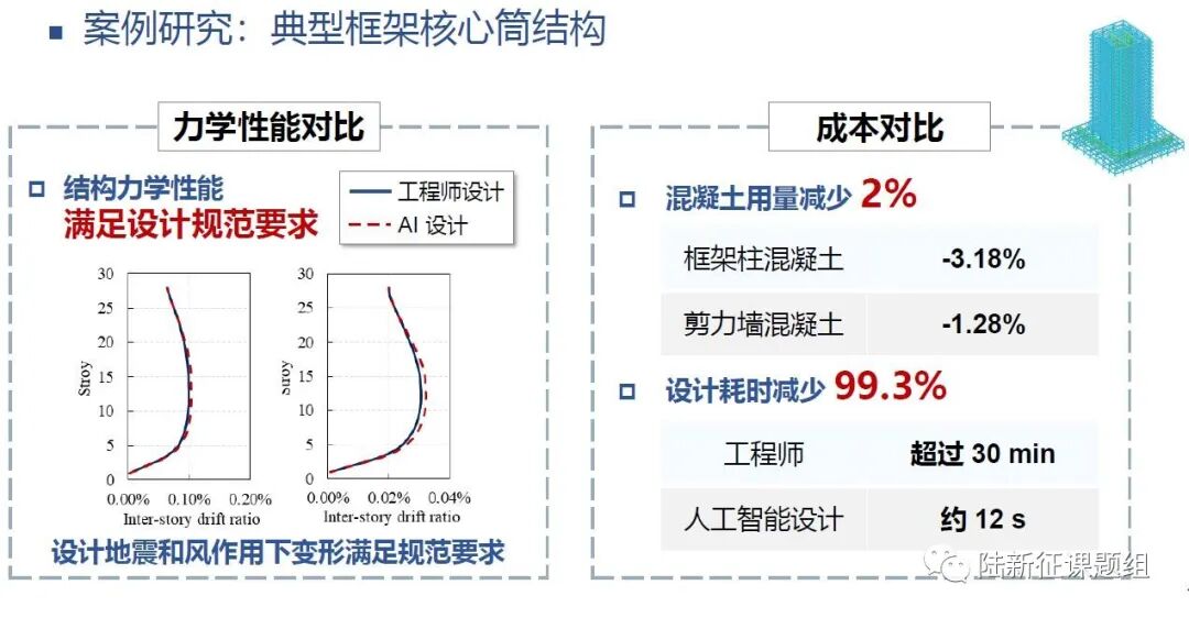针对这一问题,我们提出了基于人工智能的框架-核心筒构件截面尺寸确定方法(详见:新论文和发明专利 | 规则增强的框架-核心筒结构人工智能设计方法)。案例表明,AI设计的构件截面尺寸和有经验的工程师设计结果非常接近,而效率可以提升几十倍。