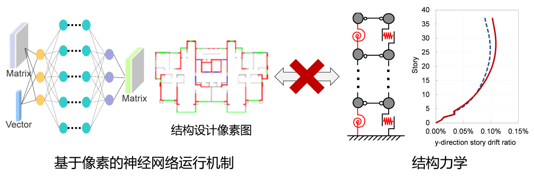那么有个小问题,力学性能评估器怎么拥有力学性能评估的能力呢?当然首先要进行结构的力学性能计算啊。我们课题组此前在高层建筑的多自由度弯剪耦合模型方面有过较好的积累。利用多自由度弯剪耦合模型,可以根据结构平面布置快速计算结构力学响应,这个模块就叫力学性能计算器(图5)。这样就可以根据AI设计的结构方案,用力学性能计算器计算出它的层间位移角是多少。(当然,本文是用层间位移角来举例说明,其他结构力学控制指标也可以用类似方法来分析)。