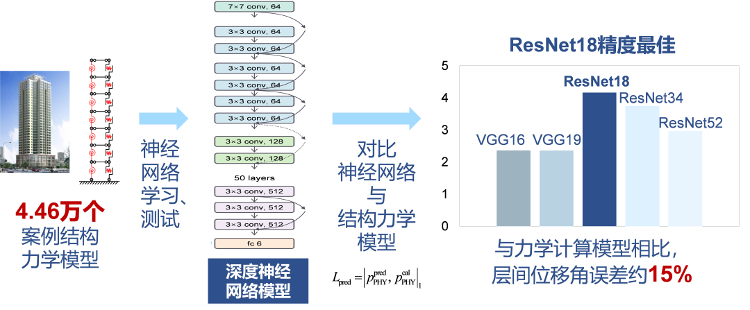 在物理增强生成对抗网络工作时,生成网络不断的设计大量结构模型,一共设计了约4.4万个结构模型。然后力学性能计算器算出这4.4万个模型的层间位移角,用于力学性能评估器进行训练。为了让力学性能评估器和神经网络优化机制无缝衔接,我们用深度神经网络来构造代理模型预测层间位移角。我们对比了不同神经网络性能,找到了一个最合适的神经网络ResNet18。这个神经网络预测的层间位移角,和力学分析模型预测结果相比,误差只有约15%(图6)。于是我们就可以用ResNet18去担任力学性能评估器。