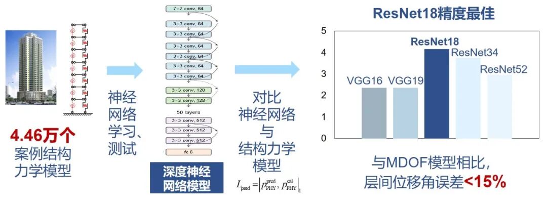 随着机器学习和人工智能技术的发展,一个很常见的选择就是用神经网络来构造一个代理模型,实现地震响应的预测。例如,我们课题组就曾经提出用ResNet18残差网络作为代理模型,通过4.46万个案例的训练,成功预测了结构的最大层间位移角[1](详见:AI想做结构设计?它得先学结构力学!| 新论文及发明专利:物理增强的剪力墙结构智能化设计方法)。